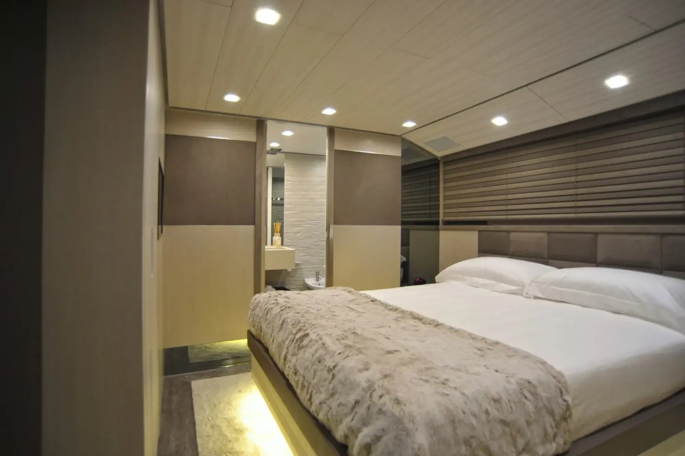 Bathrooms are made by natural stones and with natural teak floors. Ceilings and bulwarks are made by leather and dark mirrors with a particular attention to lighting scenarios.