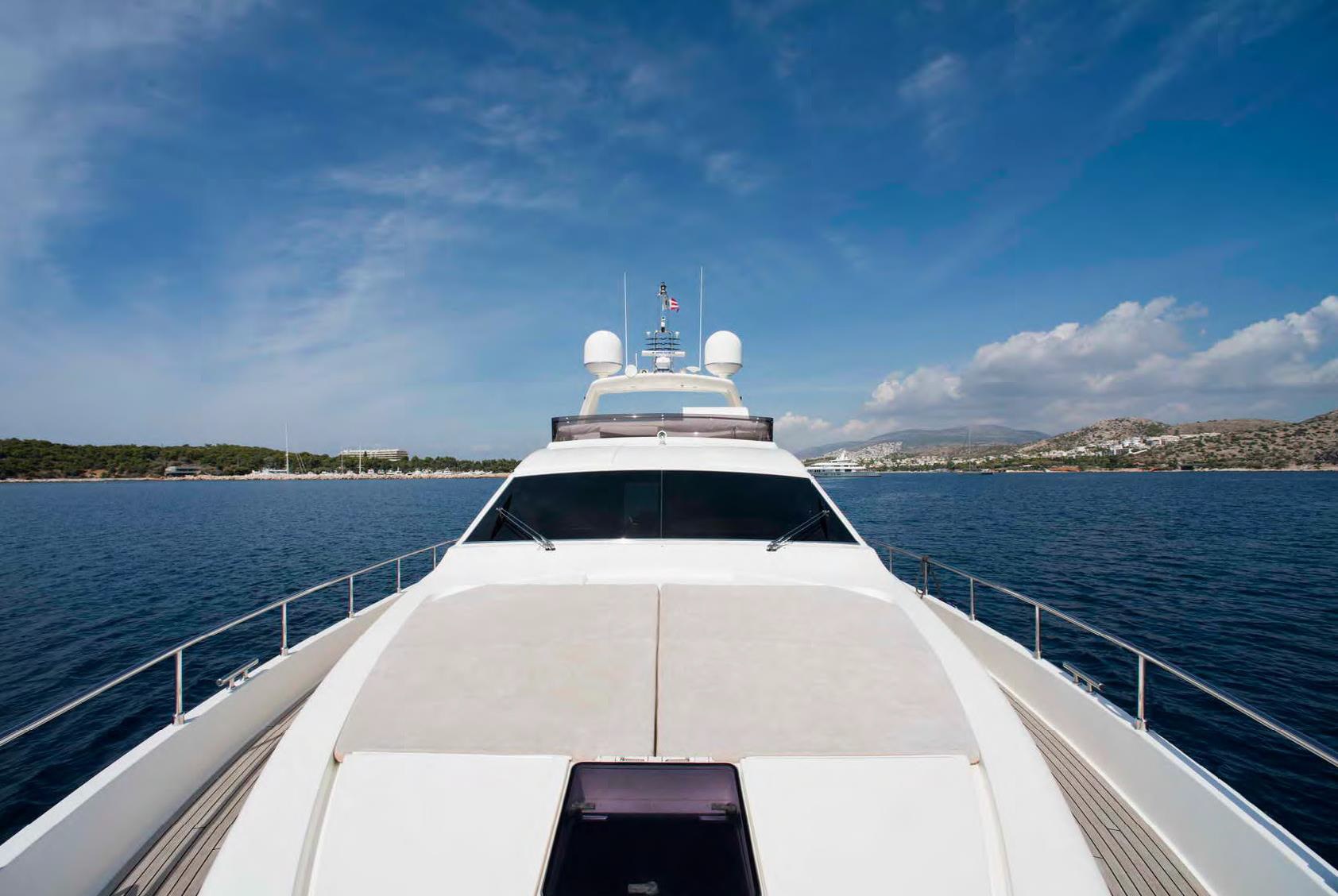 Wrap around decks leads forward to a raised sunpad on the foredeck. The yachts upper deck is well-appointed, complete with sun pads, seating, an alfresco dining option, wet bar/BBQ service station and removable Bimini cover.
