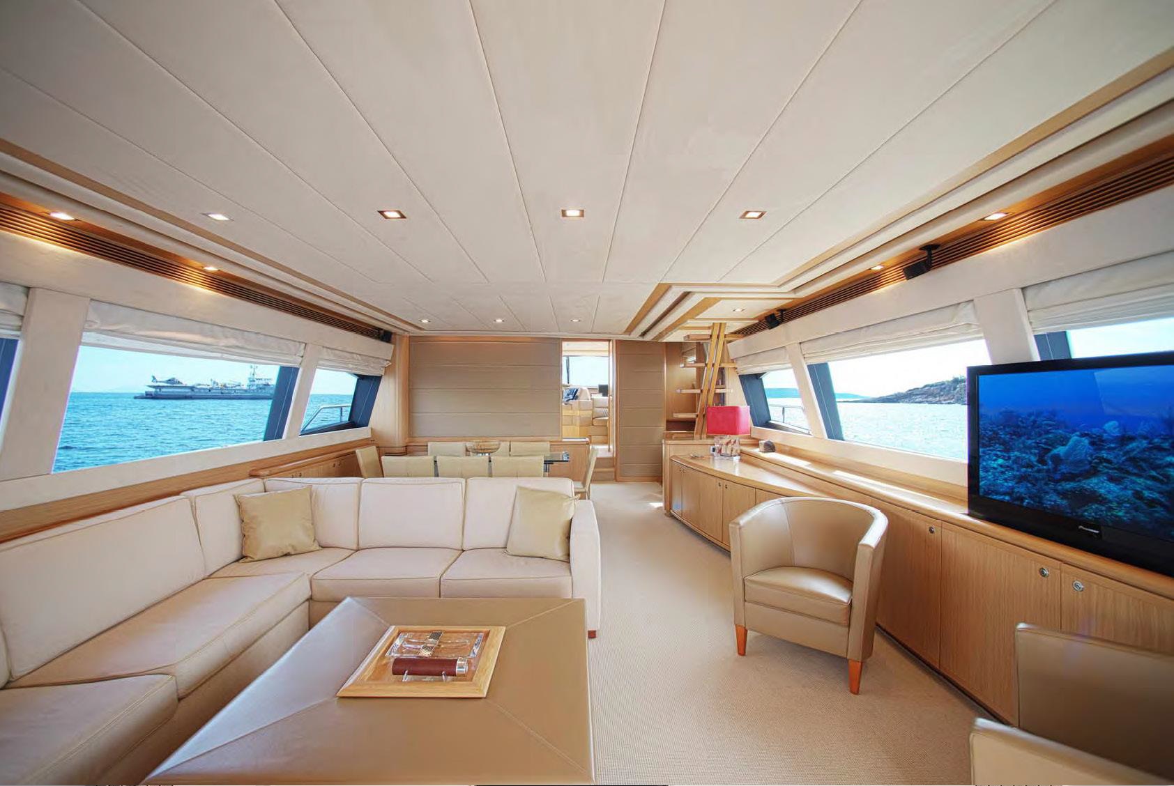 The main salon and dining is an open plan, offering the lounge aft and dining forward. The lounge is comfortably appointed with an L shaped sofa, occasional chairs, coffee table and full entertainment systems. Her dining area seats 8 guests with ease, at a clear glass table and modern cream tones chairs.