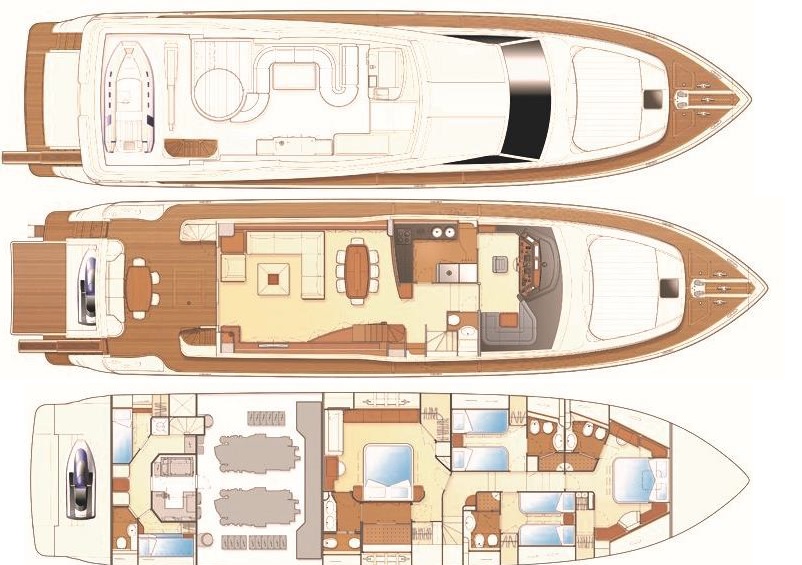 Wrap around decks leads forward to a raised sunpad on the foredeck.