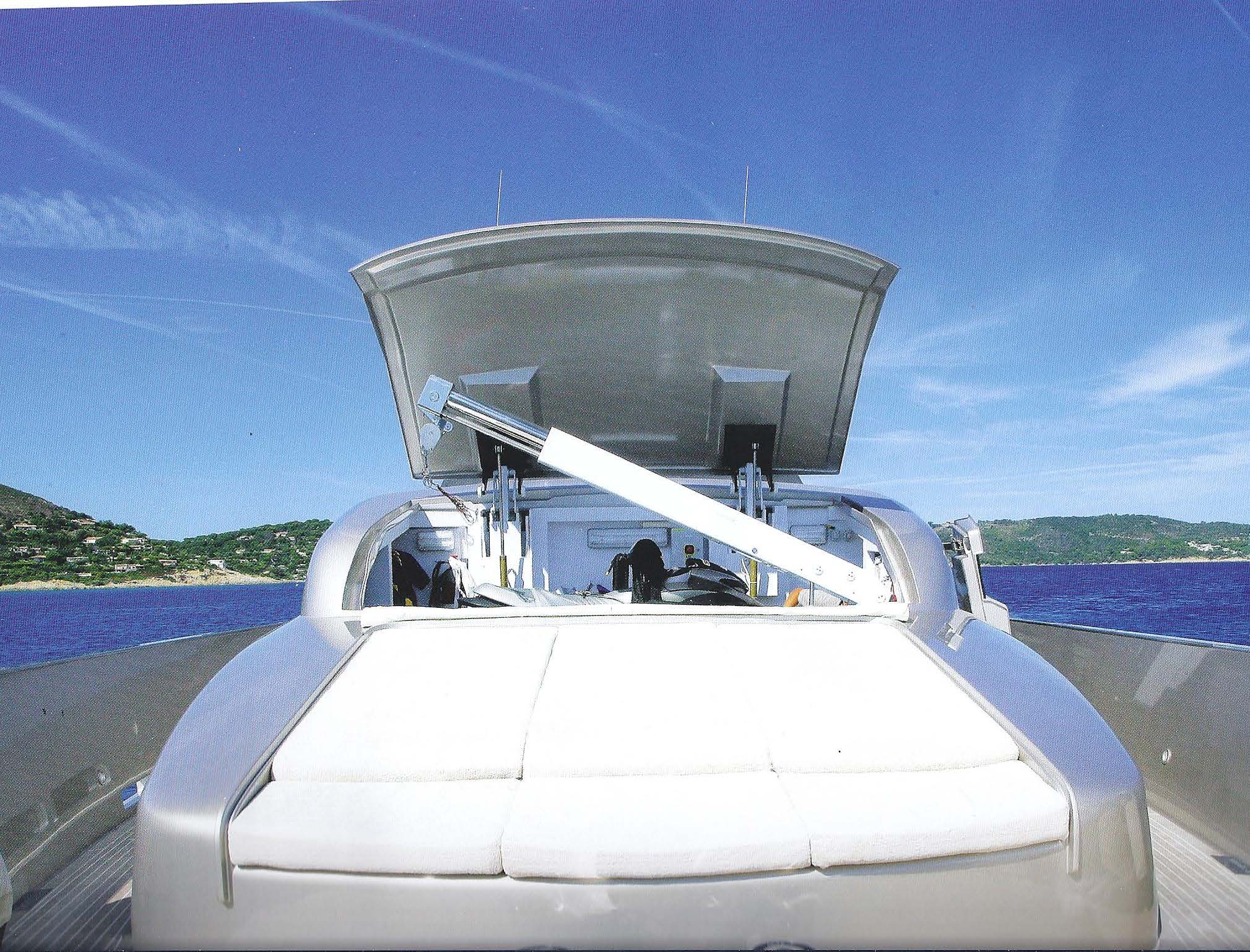 The main deck wraps around the yacht and leads forward to a large inviting sun pad. On the sundeck, there are plush sunpads, chaise loungers and a full beam seating area, with cocktail tables.
