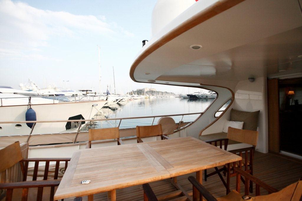 Exterior space is laid over 2 generous teak decks. The shaded aft deck is adjacent to the salon, offering an alfresco dining option, built in loungers and aft seating.