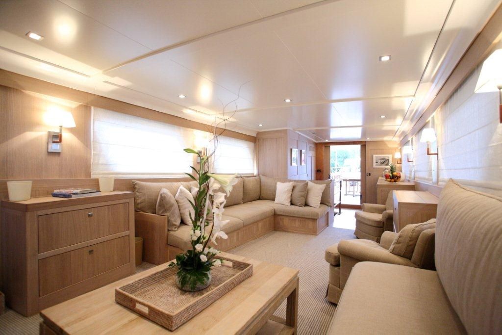 The main salon is an open plan, with the ample lounge aft, compete with sumptuous sofa and coffee table. Forward of the salon lounge is a formal dining area. The salon boasts good natural light and direct access to the exterior main aft deck. Below decks are 4 guest cabins, boasting a calm harmonious ambiance.