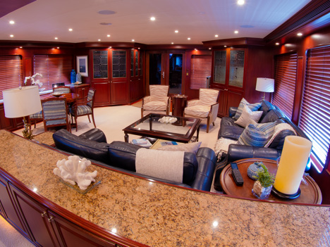 The main salon offers a large lounge space, with sofas, occasional chairs, coffee table and games / office table. Forward, a low island credenza gives a casual separation to the formal dining area. With panoramic windows ...