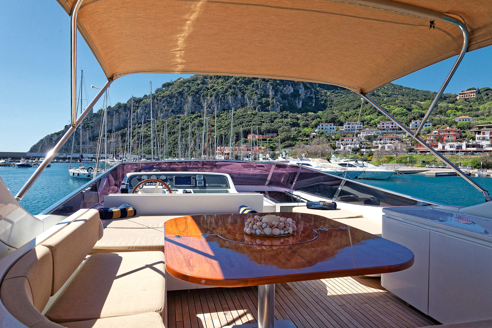 Exterior living is offered over 2 decks. The main deck has a shaded aft area, with alfresco dining and direct access to both the salon and extended swim platform on the transom.