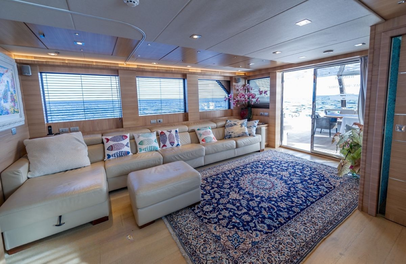 The spacious salon offers a large lounge with a plush sofa, bespoke pale wood panels and plenty of natural light. Full entertainment systems include a large drop down TV, SKY and surround sound. Further forward is the formal dining area. A day head is available on the main deck level.
