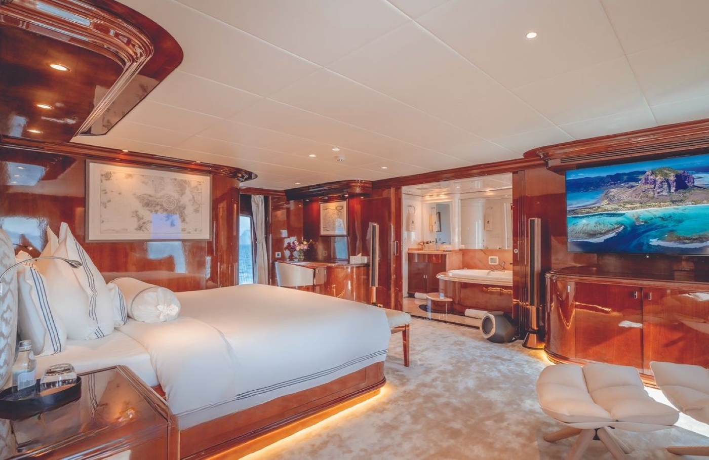 The upper salon features a continuation of the high-quality build of the lower salon, boasting sophisticated cherry woods, plush soft furnishings, and incredible natural light. The VIP cabin is to port and forward of the salon, with a walk around queen size bed, study space and exceptional views from an elongated window.
