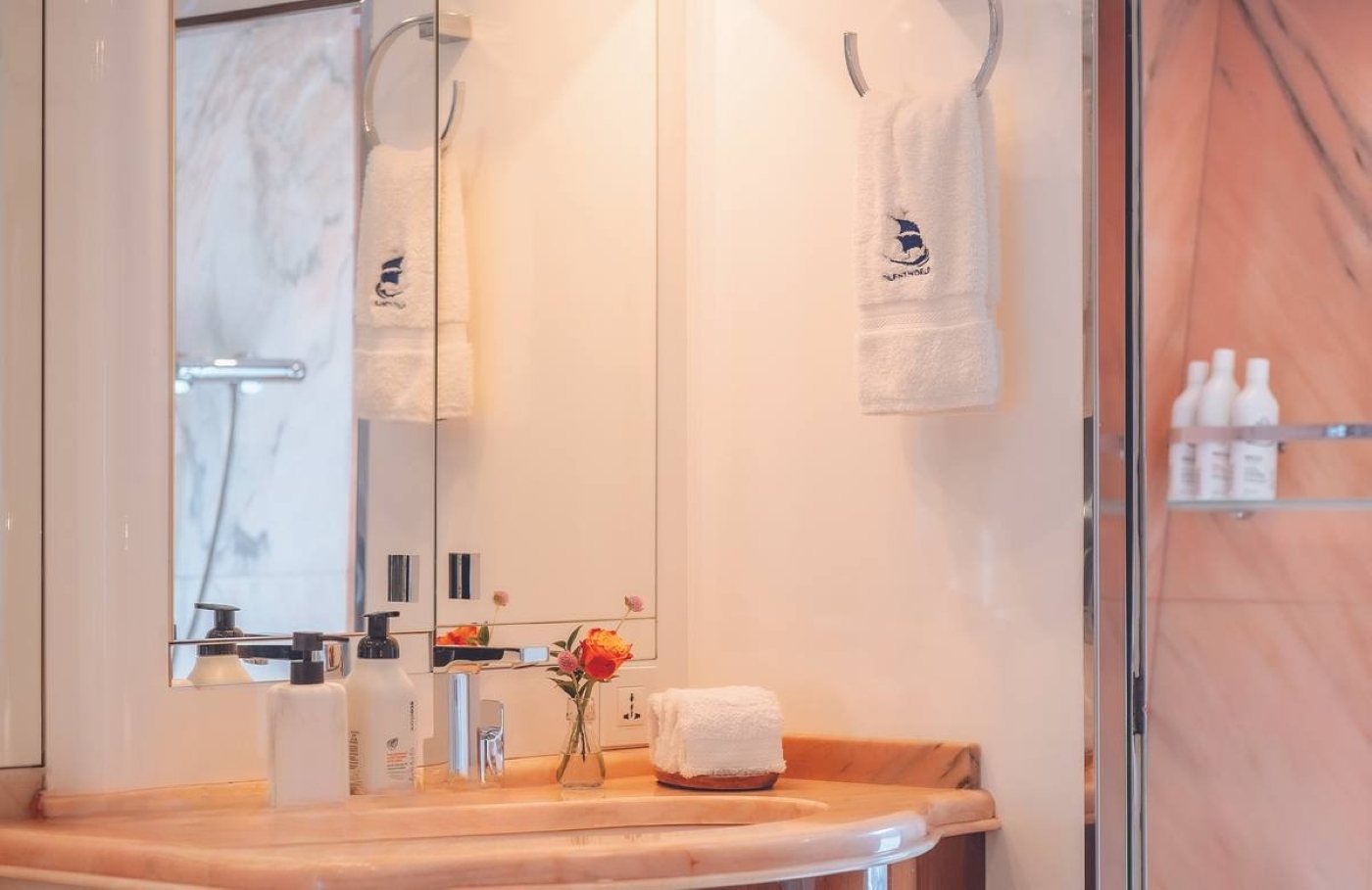 The master cabin is on the main deck, forward of the salon and full beam of the yacht, with a king size bed, private seating, spectacular en-suite with large tub and fantastic views. The VIP cabin is on the upper deck port side, with a queen size bed, study space, en-suite and panoramic views.