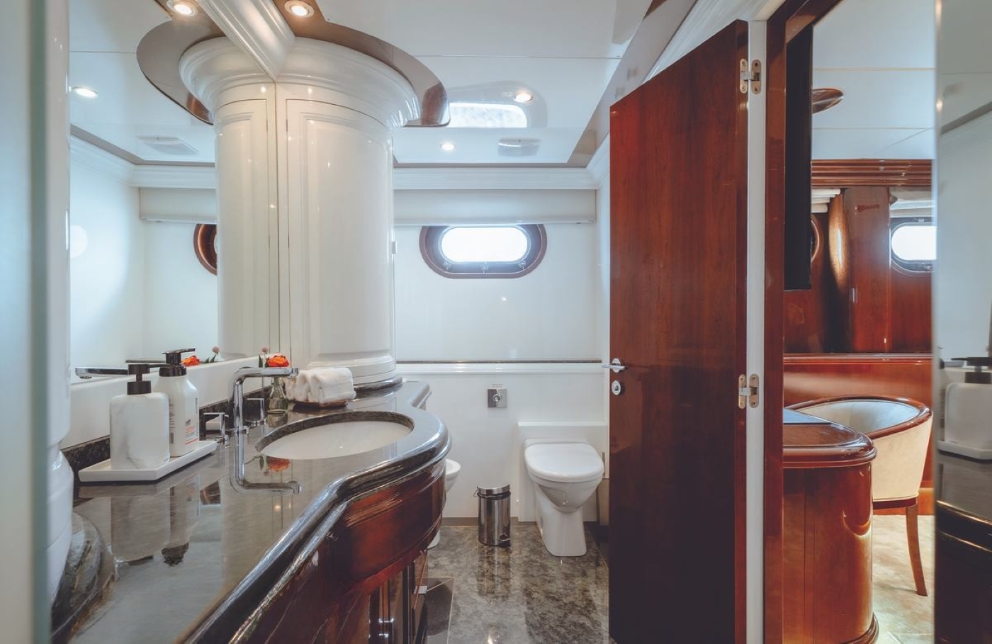 The master cabin is situated on the main deck forward and spreads full beam of the yacht, offering a king size bed, private seating area and large en-suite, complete with a deluxe tub. The master cabin enjoys fabulous views and ...