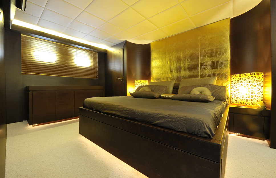 Under full power, the yacht can reach impressive top speeds of 38 knots. Accommodation is on the lower deck. The master stateroom is full beam of the yacht and amidships, with a center lined king size bed. The VIP cabin has a center lined queen size bed. A further twin cabin offers side by side twin beds.