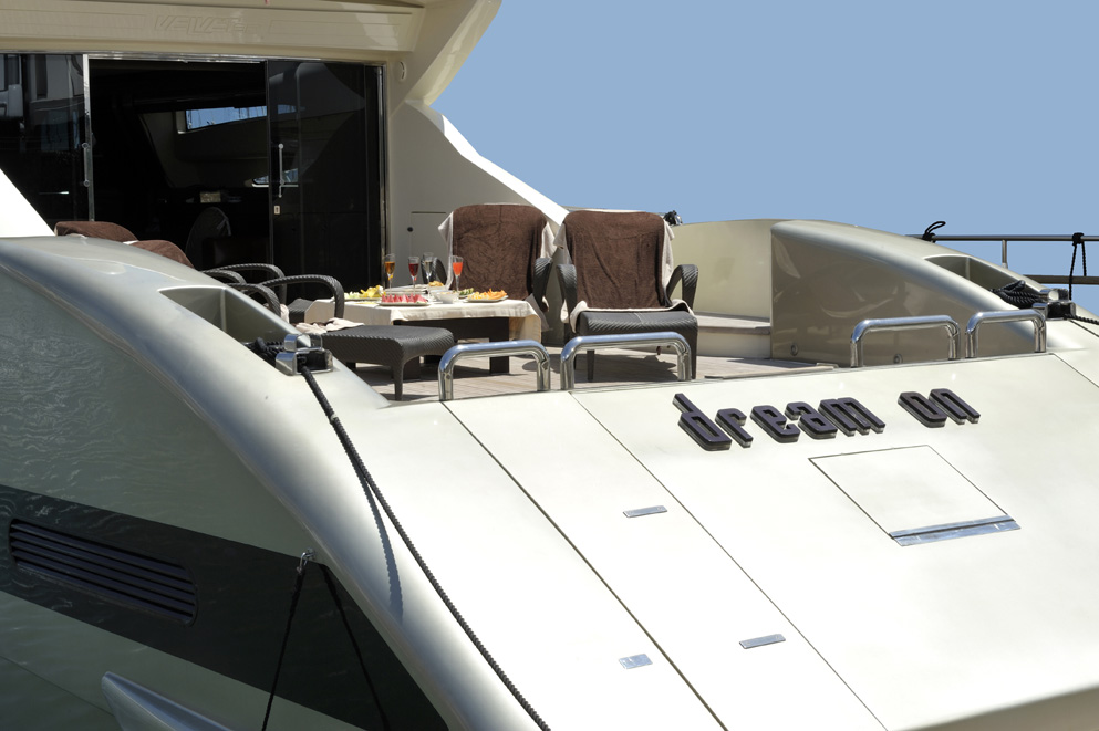 Motor yacht DREAM ON is a 27,7m (90.11ft) Tecnomar Velvet 90 design. The yacht offers accommodation for up to 6 charter guests, in 3 cabins.