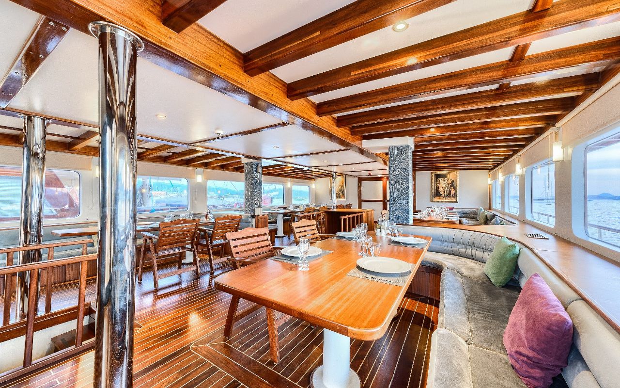 The yachts interior salon and open plan dining easily seats all 32 guests and includes full air-conditioning and entertainment facilities.