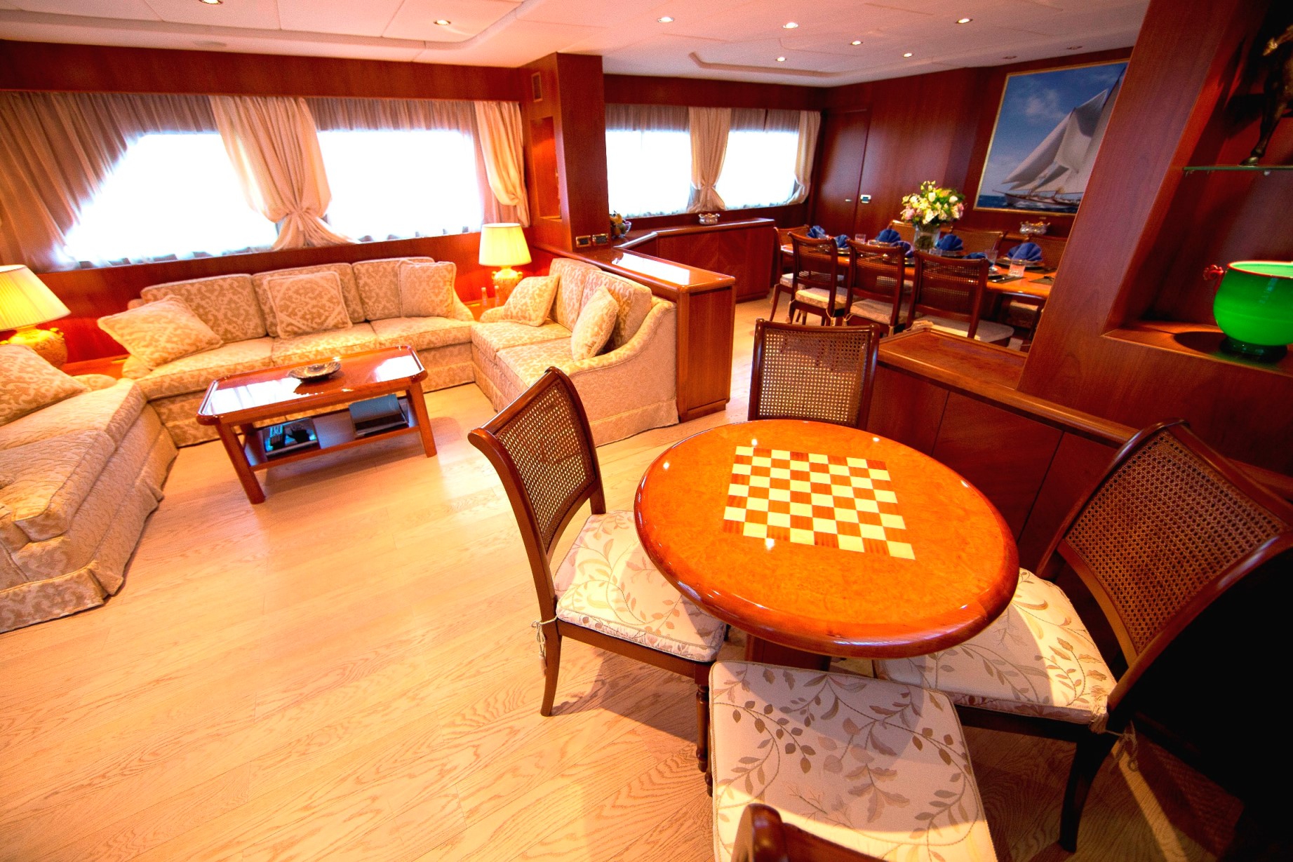 She features neutral soft furnishings throughout and a timeless balance of pale and warm woods. The main salon and dining is an open plan. The spacious lounge is aft and has a large sofa, coffee table, opposing settee, games table and entertainment systems.