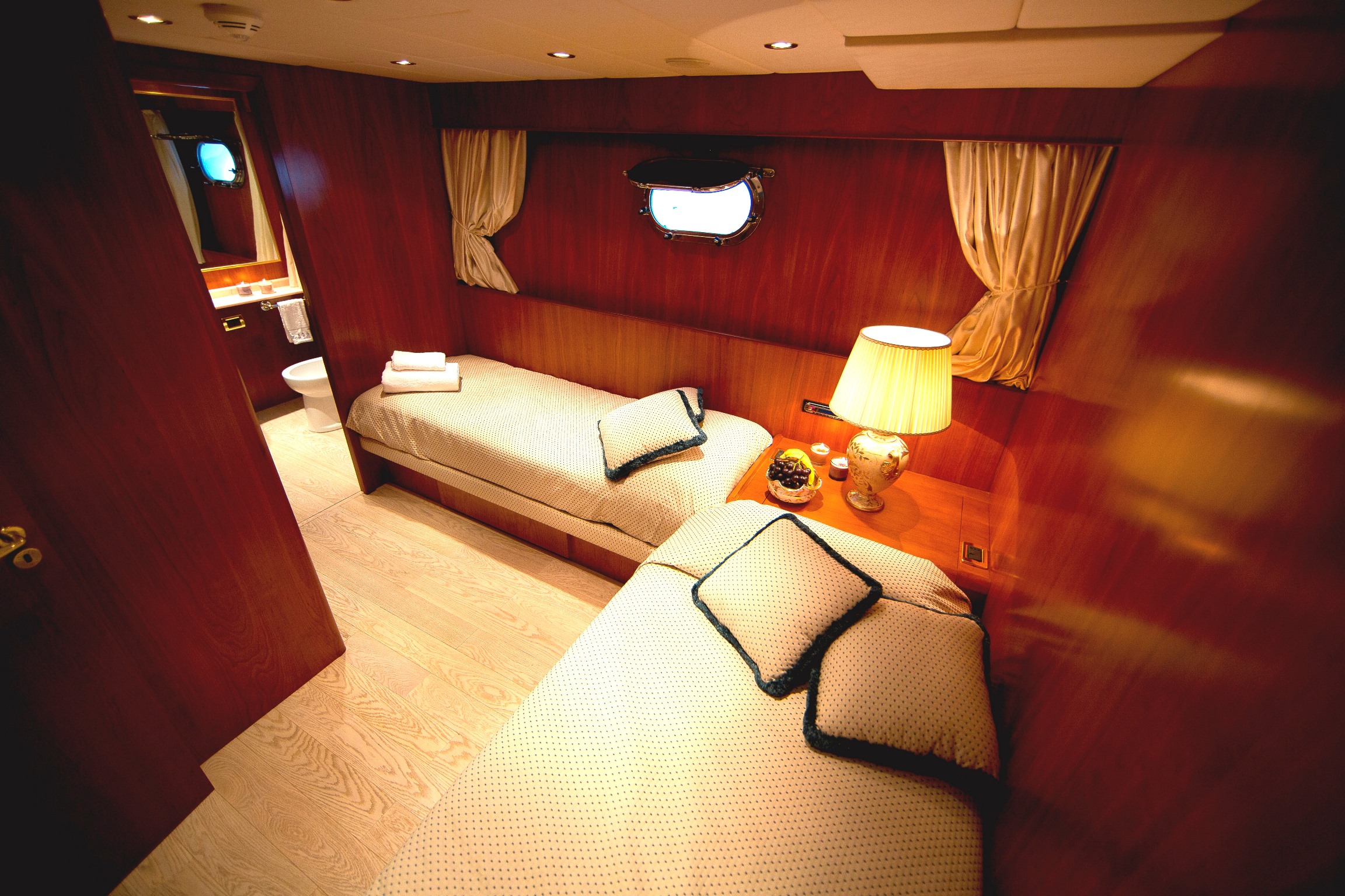 Forward, the formal dining area is centered, offering a beautifully finished high gloss wood table. Panoramic windows allow for ample light, while sheer curtains offer good amount of privacy. Guest accommodation is luxurious, the master cabin is forward of the salon and full beam of the yacht. Below deck are 2 VIP cabins and 2 twin cabins.