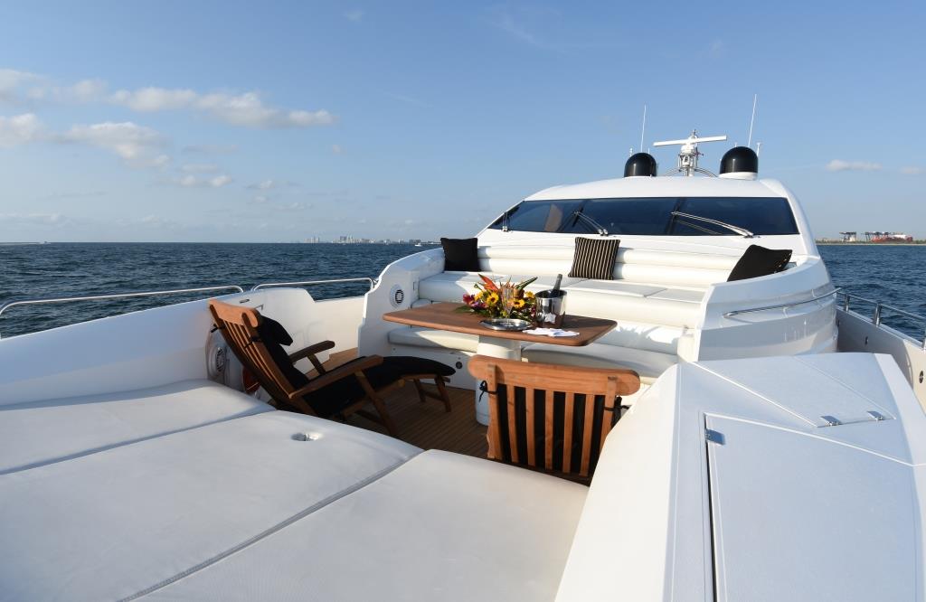 On the foredeck is an additional alfresco dining area, ample seating and generous a luxurious sunpad.