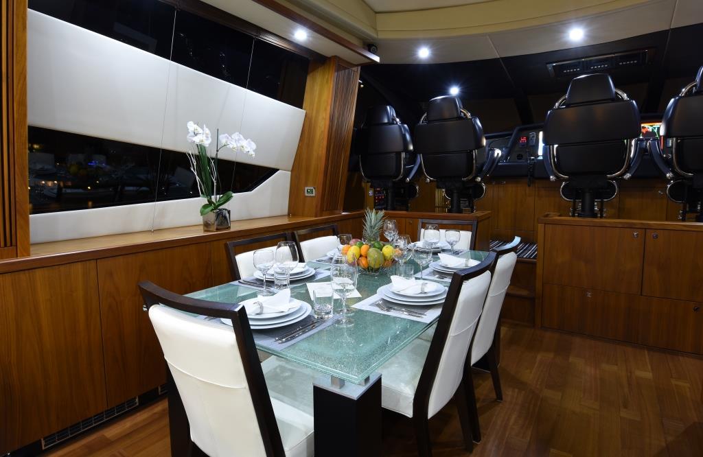 Forward of the salon lounge is the contemporary formal dining space, offering a spectacular glass table top, with an adjacent glass topped wet bar. With a retractable roof, full side windows, forward facing windscreen and wide sliding glass doors aft, the social salon is light, spacious and great for entertaining.