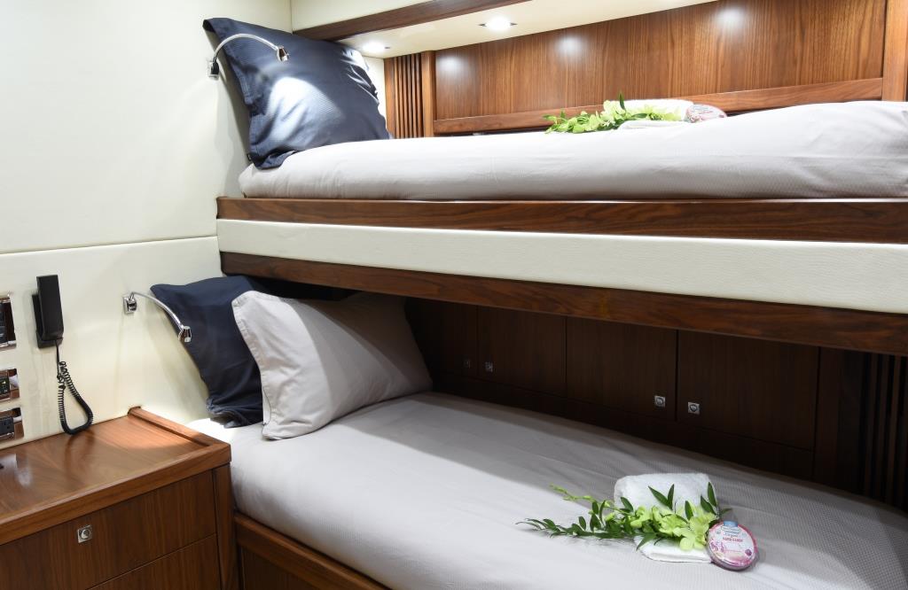 A twin cabin offers side by side single beds and a further cabin has side by side twin beds and one upper bunk. DOUBLE D has the following Tenders & Toys: