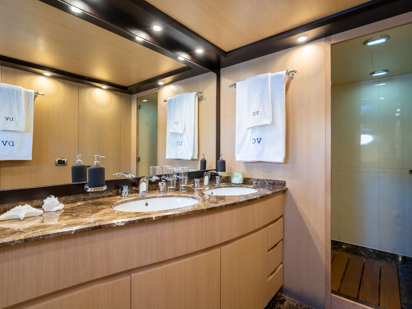 The lounge is placed to port and consists of three sofas around a coffee table, and forward to starboard is a drinks/games table to seat four.