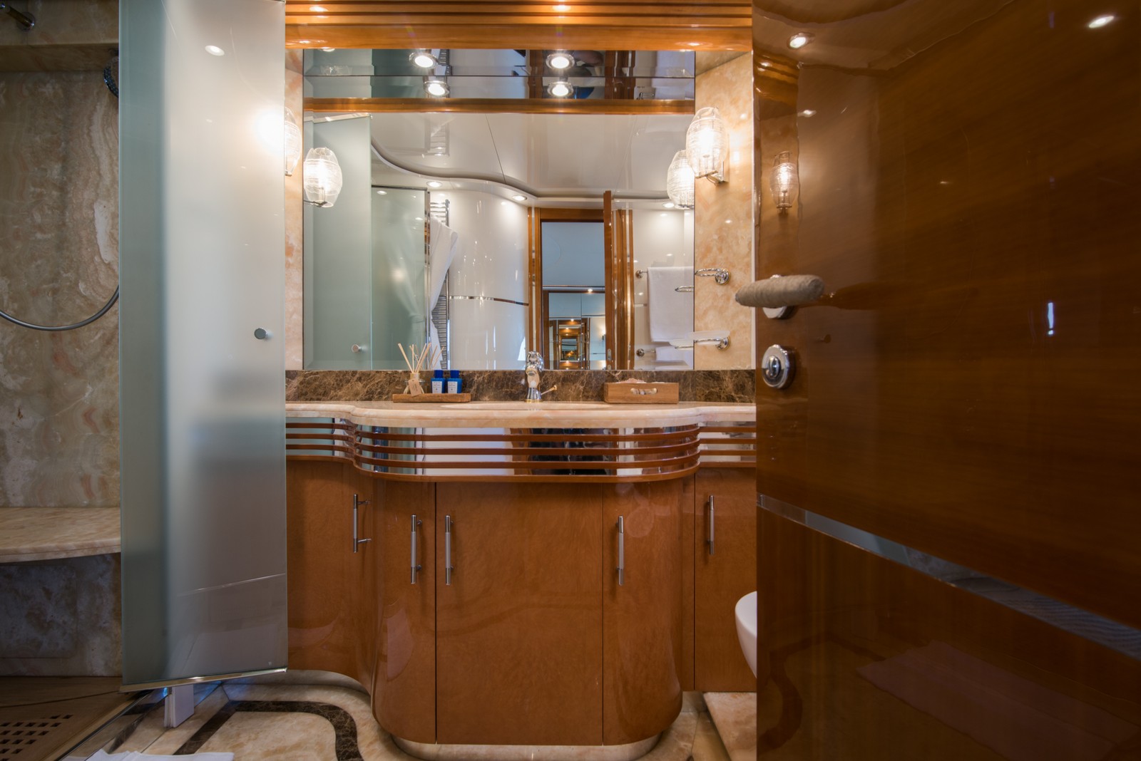 The master stateroom is amidships and full beam of the yacht, with a center lined queen size bed, sofa, vanity and large en-suite bathroom, with adjoining shower and his and hers facilities. The VIP cabin is forward and full beam of the yacht, with a center lined queen size bed. Two guest cabins each have side by side twin beds.