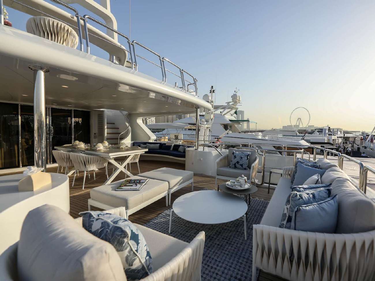 The main deck aft features a large alfresco dining table and direct access to the salon, ideal for formal or casual entertaining. On the upper deck, adjacent to the sky lounge, is a further alfresco dining table under overhead shade, followed by plush exterior furnishings.