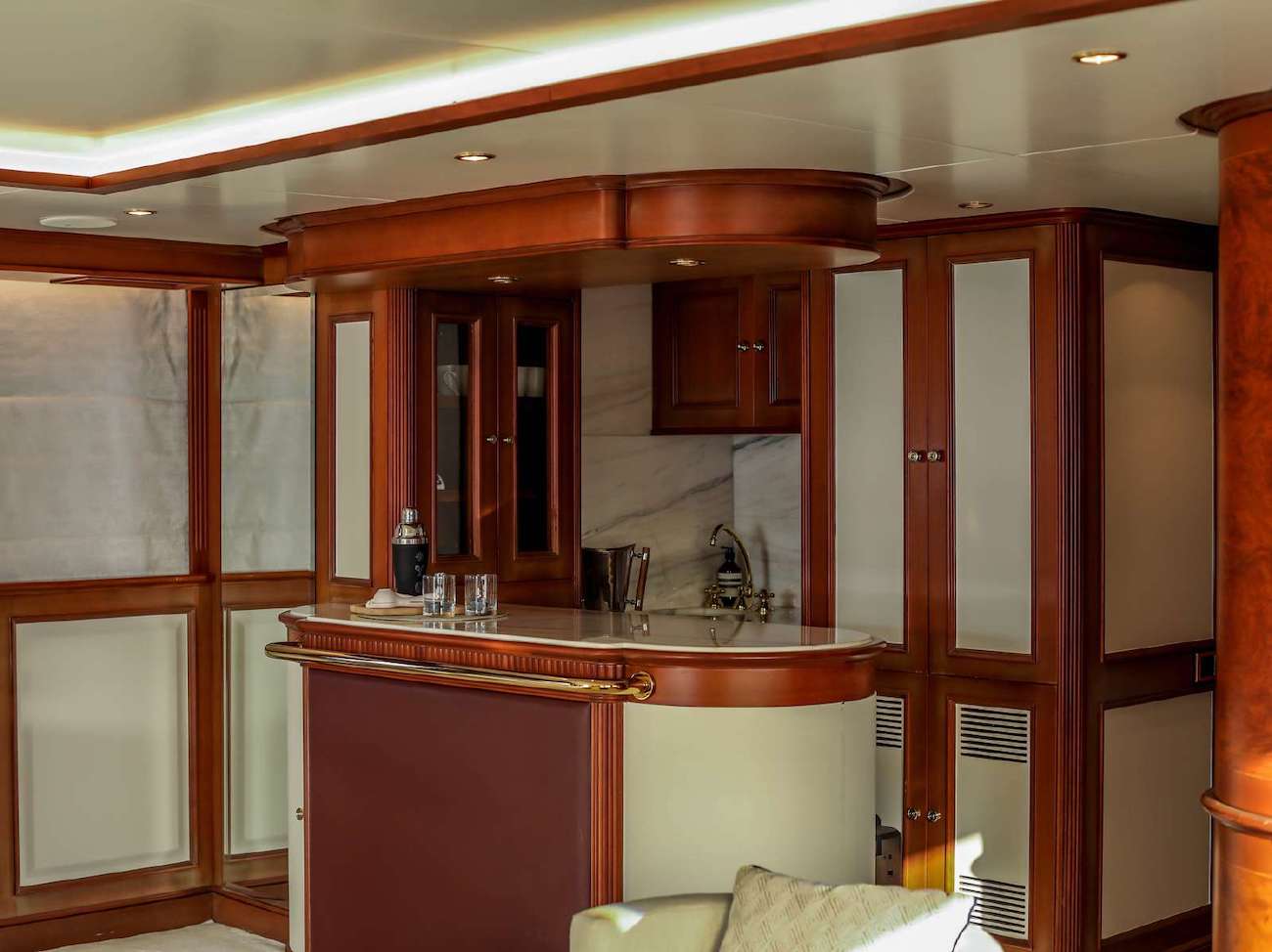 An upper sky lounge offers further seating, a desk and an inviting wet bar. Accommodation aboard the yacht is in 5 generous cabins.