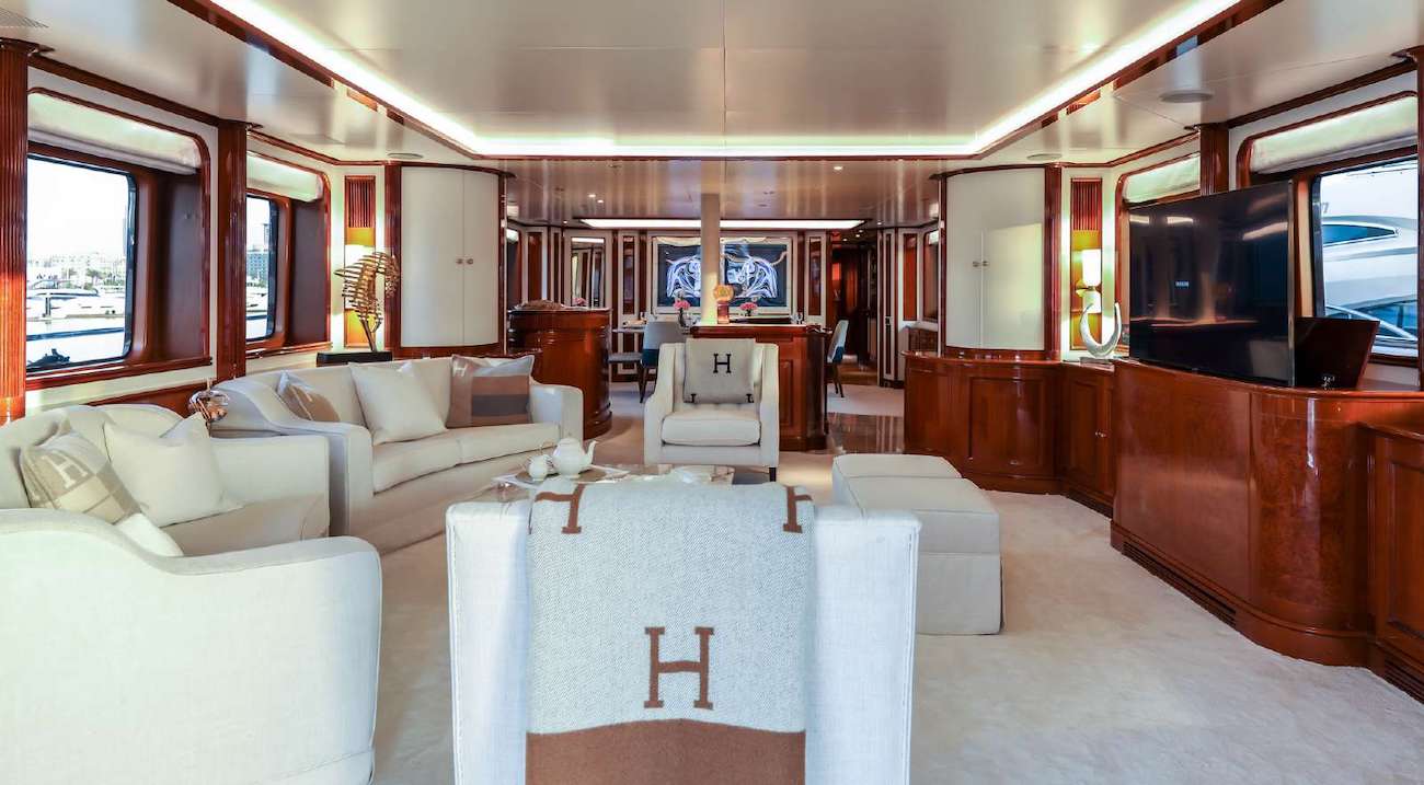 The salon lounge on the main deck offers plenty of relaxing seating and is surrounded by panoramic windows. Further forward on the starboard side, the guest foyer leads to the stylish formal dining area. An upper sky lounge offers further seating, a desk and an inviting wet bar. Accommodation aboard the yacht is in 5 generous cabins.