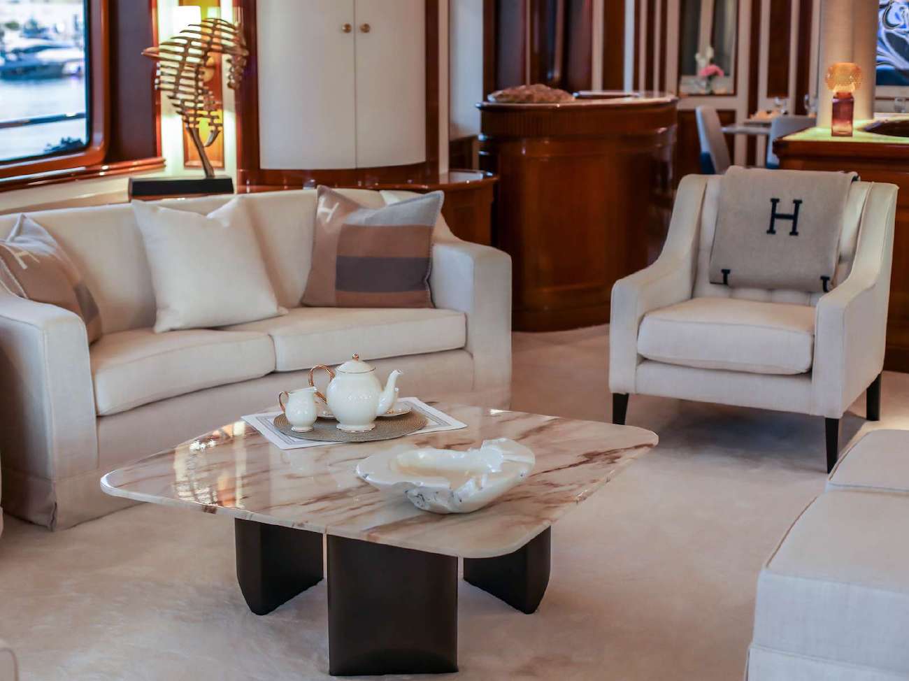 On the upper deck, adjacent to the sky lounge, is a further alfresco dining table under overhead shade, followed by plush exterior furnishings. The sundeck is partially shaded with a wet bar, alfresco dining, chaise loungers, ample seating and deluxe Jacuzzi tub.