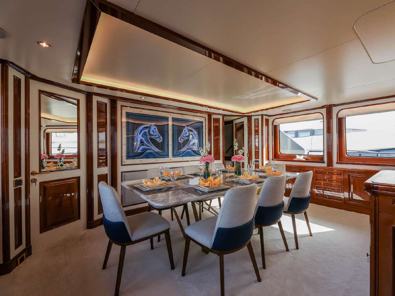 Further forward on the starboard side, the guest foyer leads to the stylish formal dining area. An upper sky lounge offers further seating, a desk and an inviting wet bar. Accommodation aboard the yacht is in 5 generous cabins.