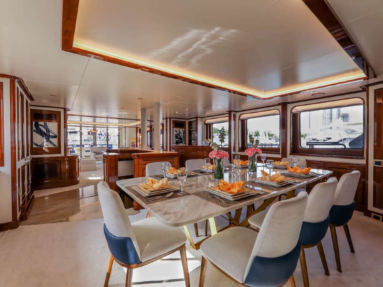 Further forward on the starboard side, the guest foyer leads to the stylish formal dining area. An upper sky lounge offers further seating, a desk and an inviting wet bar. Accommodation aboard the yacht is in 5 generous cabins.