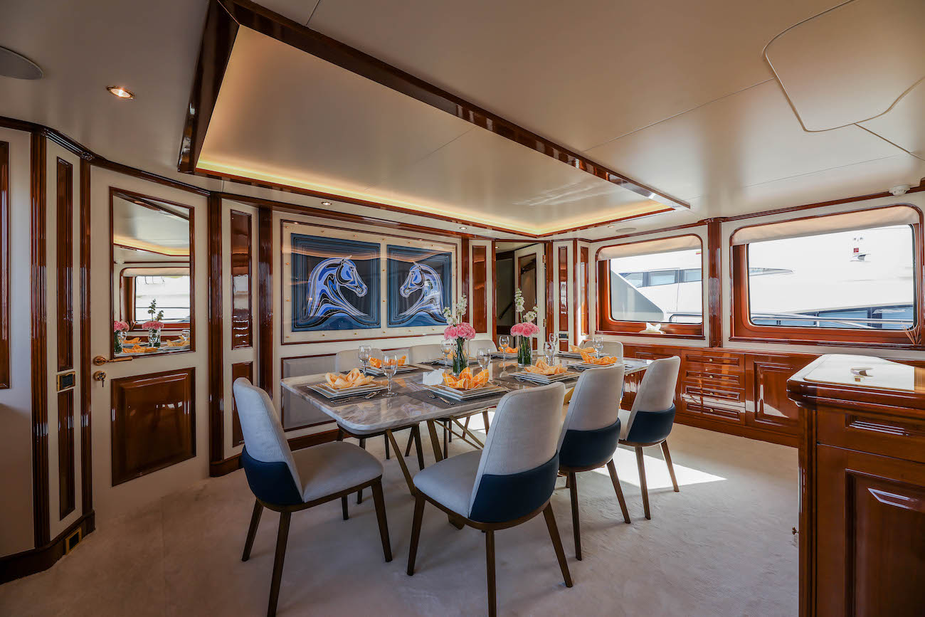 Further forward on the starboard side, the guest foyer leads to the stylish formal dining area. An upper sky lounge offers further seating, a desk and an inviting wet bar. Accommodation aboard the yacht is in 5 generous cabins.