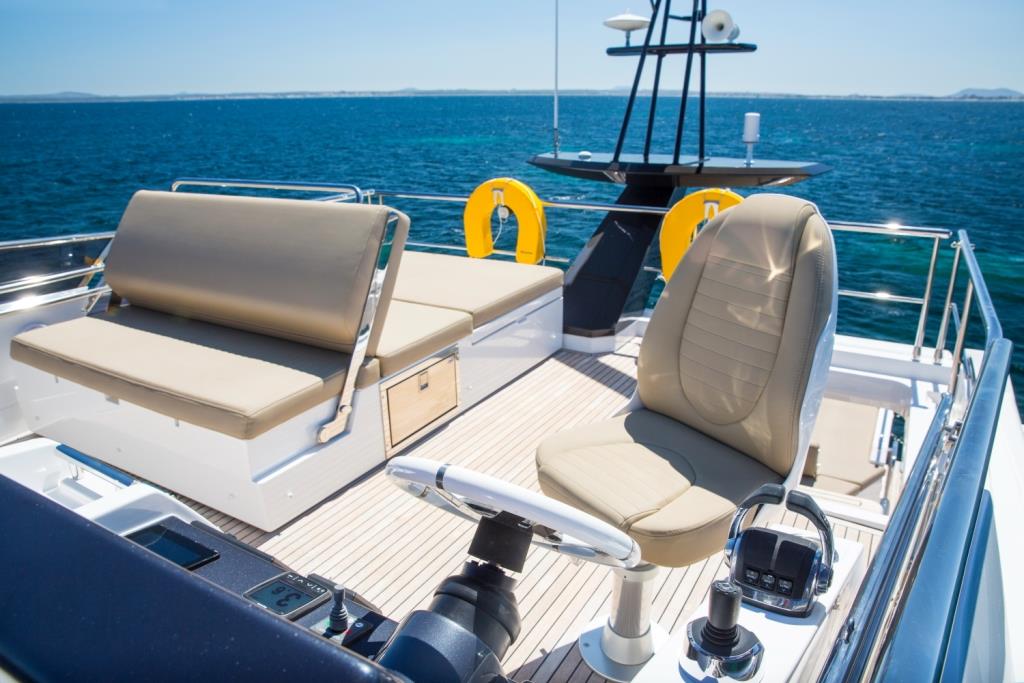 The yacht offers a flybridge complete with optional partial shade, seating and 2 sunpads.