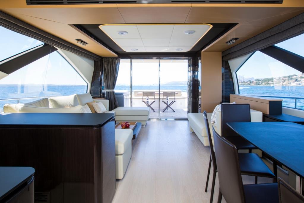 The main salon features opposing leather sofas, coffee table and entertainment systems, while forward in an open plan is the formal dining. Thanks to panoramic windows, she offers great views out and ample natural light.