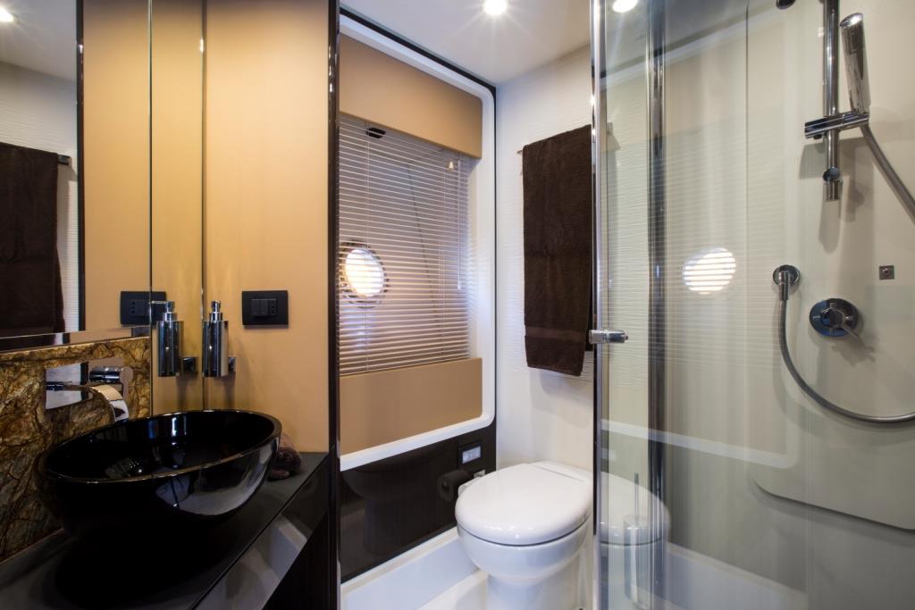 Accommodation is in 4 ensuite cabins. The master stateroom is amidships and full beam of the yacht, with a center lined queen size bed, walk in wardrobe, seating and vanity. The VIP cabin is forward and full beam of the yacht, with a center lined queen size bed. Two additional guest cabins each have side by side twin beds.