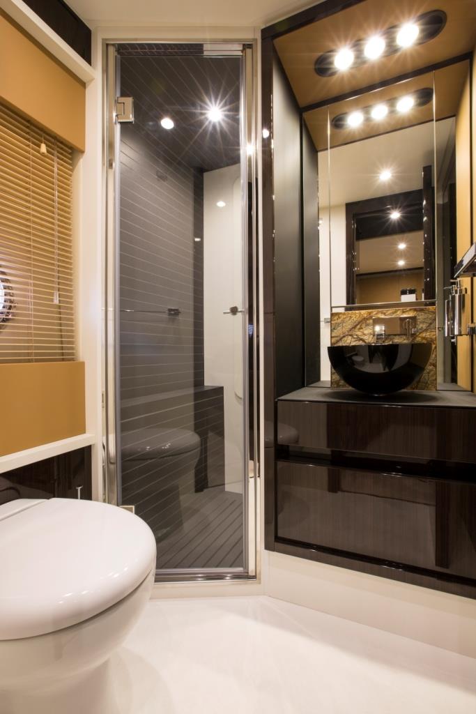 Accommodation is in 4 ensuite cabins. The master stateroom is amidships and full beam of the yacht, with a center lined queen size bed, walk in wardrobe, seating and vanity. The VIP cabin is forward and full beam of the yacht, with a center lined queen size bed. Two additional guest cabins each have side by side twin beds.