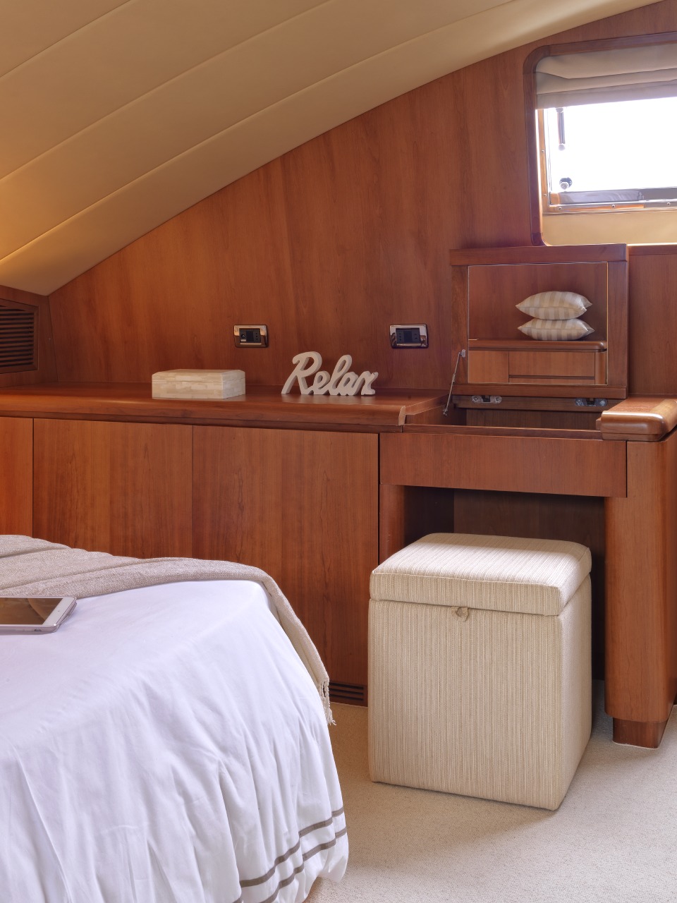 Her interior is bright with natural light and features soothing neutral warm wood panels and contemporary furnishings.