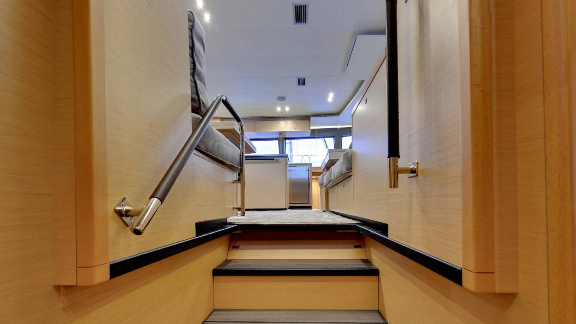 Both the port and starboard hulls contain two double cabins, with the crew accommodation placed within the bow. A staircase leads up to the main salon, within which there is a port-side galley with an island counter containing a widescreen TV.