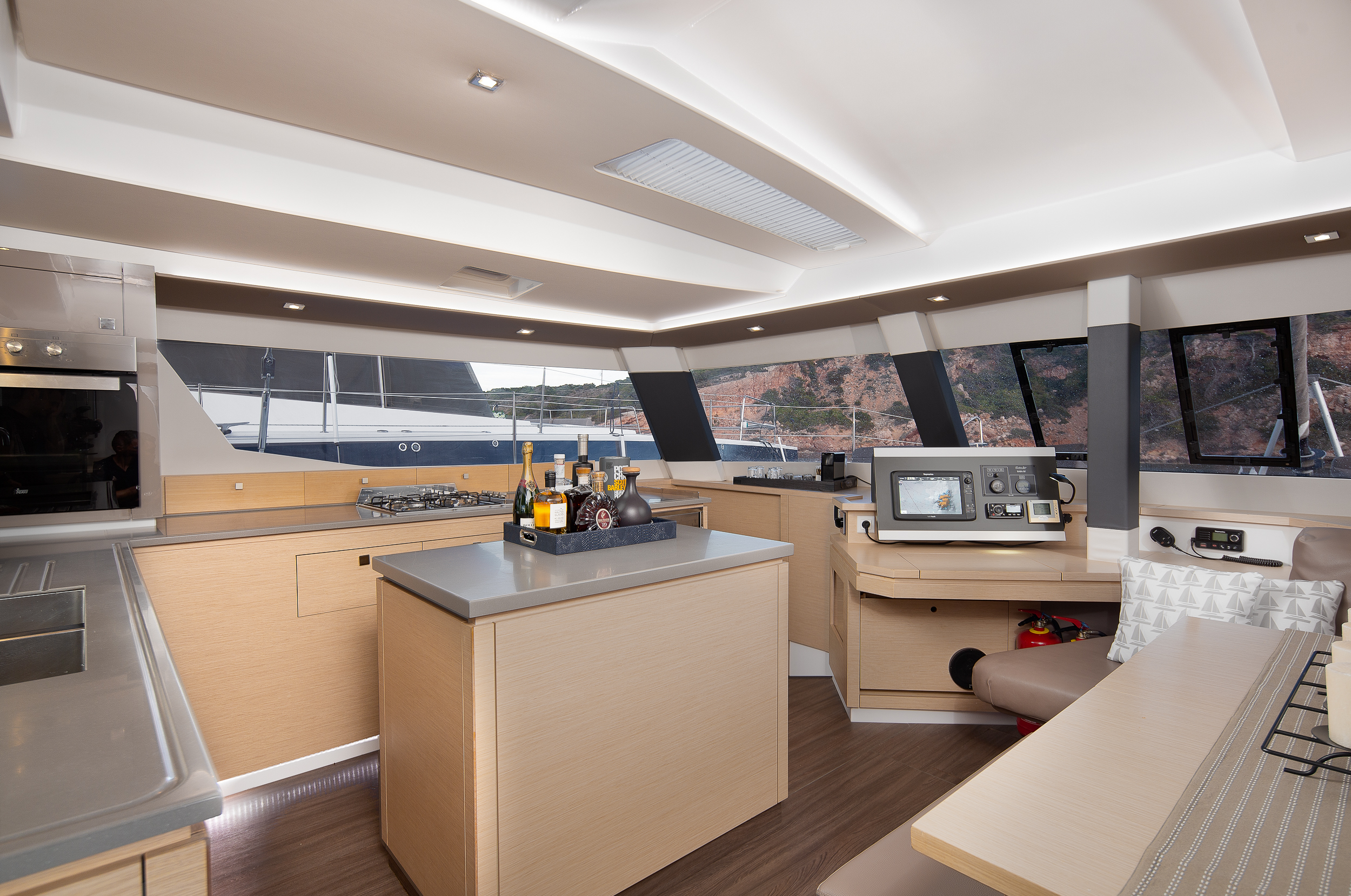 The galley is laid to port creating a social atmosphere with crew and guests.