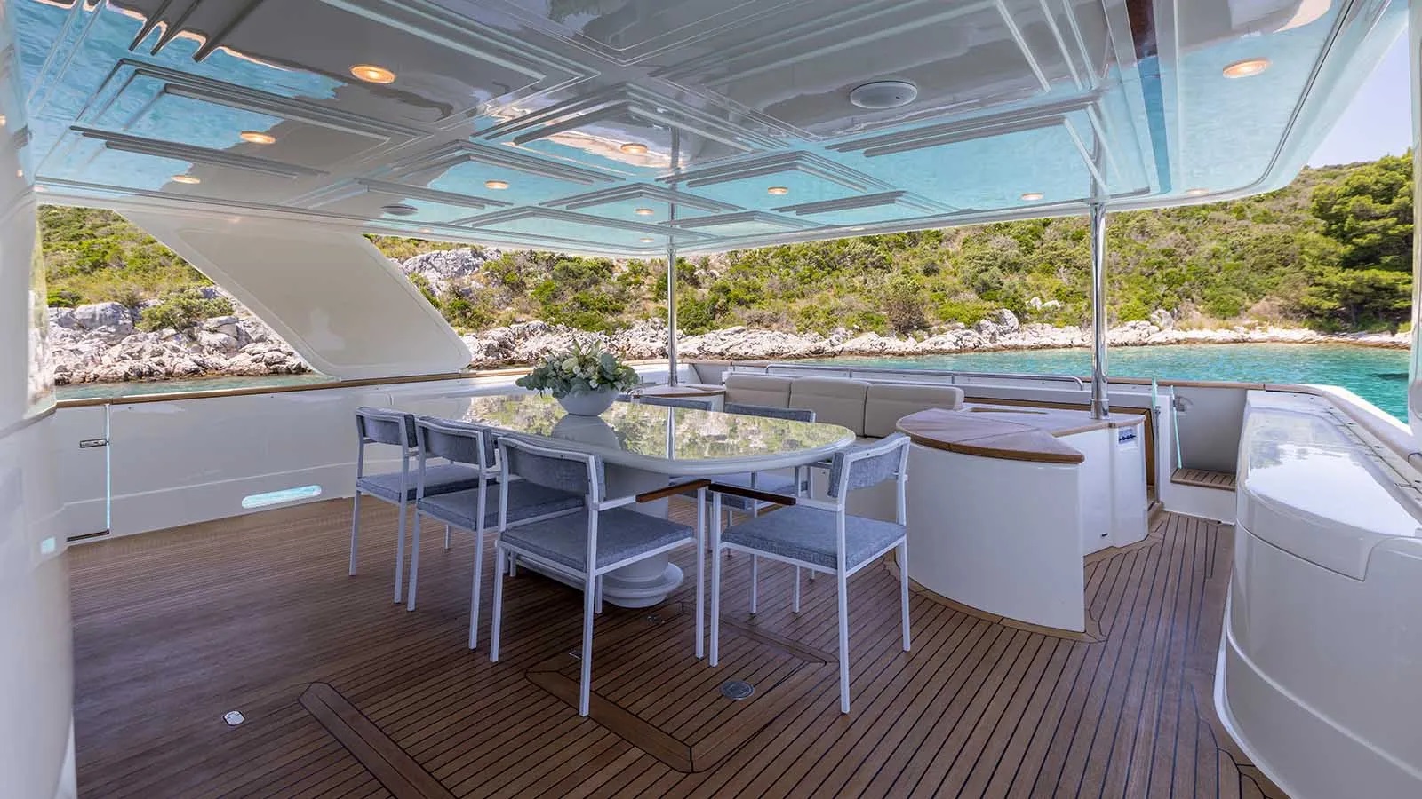 The contemporary layout offers a sumptuous lounge aft, and formal dining forward. The lounge boasts a generous 3-piece leather suite, with coffee table and ottoman. The formal dining features a round table flanked in high back leather chairs, easily seating 8 guests.