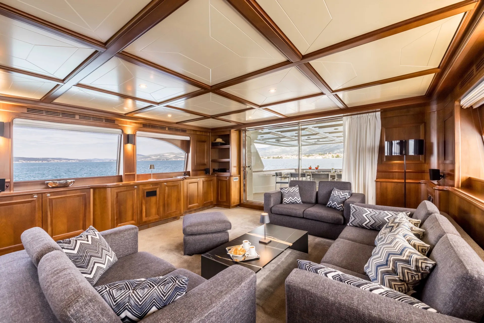 The main deck salon has beautifully finished planked flooring, warm wood panels and classical beamed ceilings. The contemporary layout offers a sumptuous lounge aft, and formal dining forward. The lounge boasts a generous 3-piece leather suite, with coffee table and ottoman.