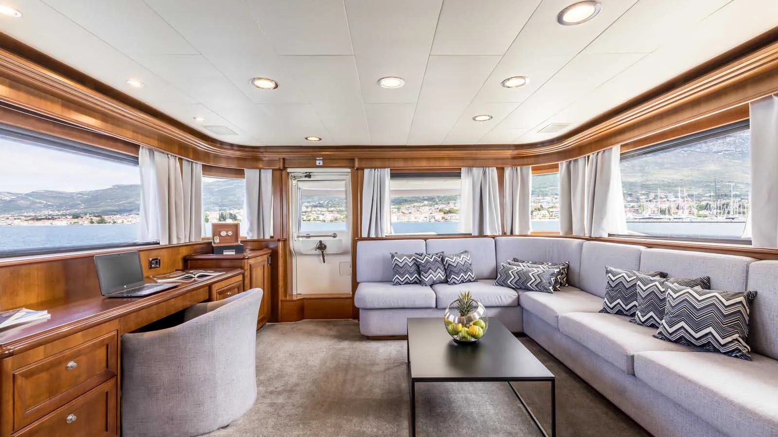 An upper skylounge has an L shaped sofa, settee and coffee table.