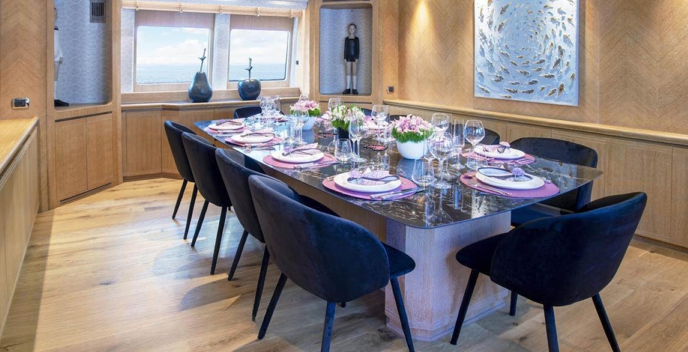 Upon entrance, you are greeted by two comfortable armchairs, before accessing the main seating area that is composed of three ample and comfortable sofas around a large coffee table. Forward of the salon is a day head and stairs leading down to the 5 generous cabins, as well as a separate dining room and large galley.