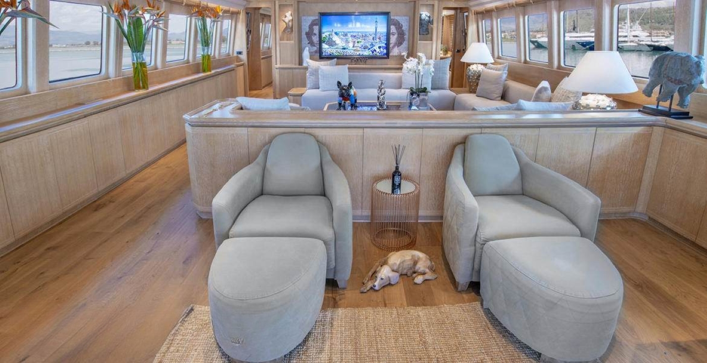 The salon of this luxurious motor yacht is welcoming and bright, with large windows all around that let in lots of natural light. Upon entrance, you are greeted by two comfortable armchairs, before accessing the main seating area that is composed of three ample and comfortable sofas around a large coffee table.