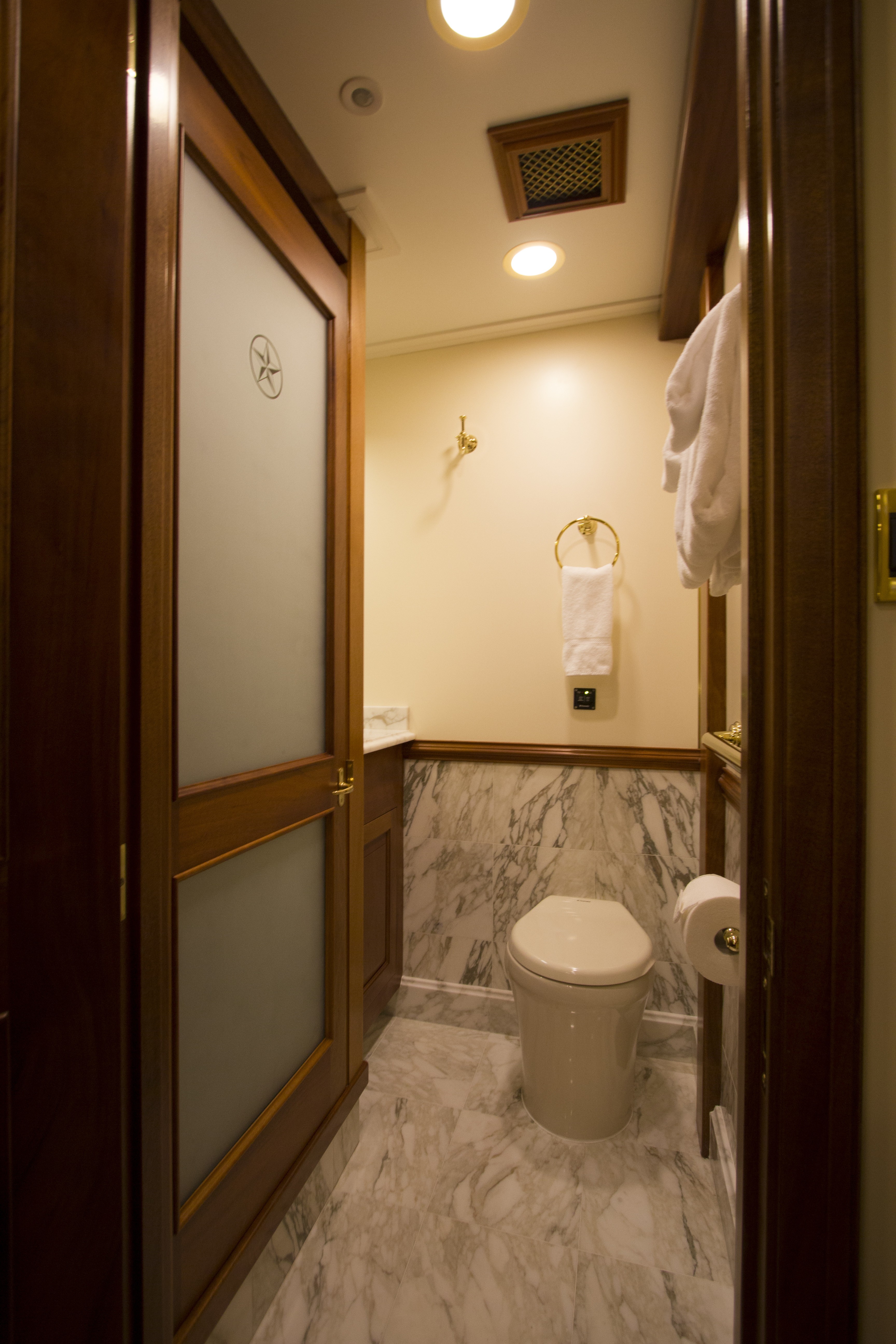 On the port side is a formal dining table, while to starboard is the lounge with convertible coffee to a cocktail table, and electric fireplace. The galley is forward of the salon in a contemporary open plan, allowing guests to mingle with the chef in a more casual, modern atmosphere.
