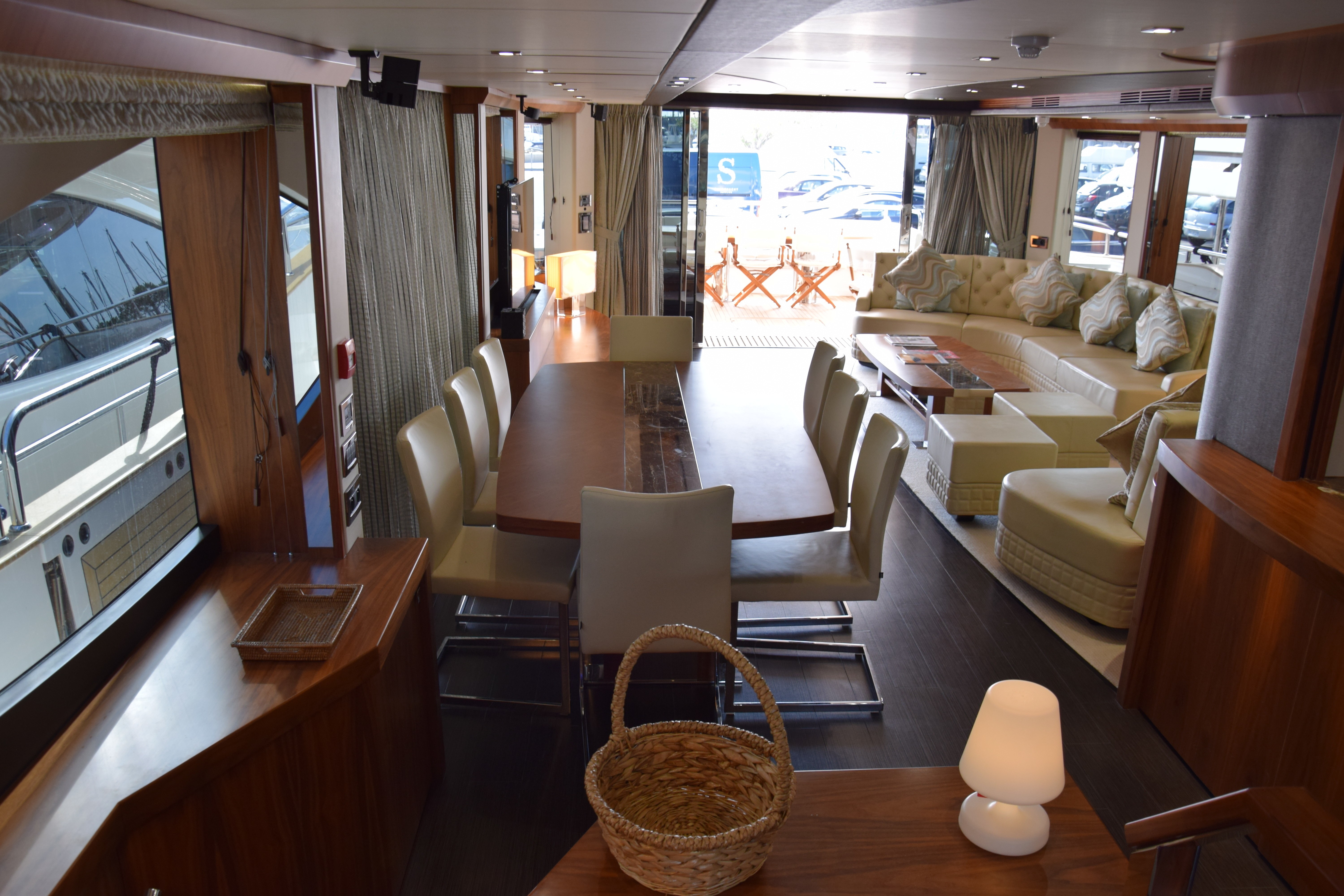 There is a banquette seating area adjacent to the main helm controls to allow guests to sit with the captain.