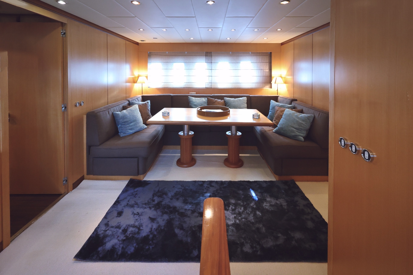 The main deck décor features gloss wood furniture and flooring with neutral sofa seating surrounding a dining table to port and coffee tables to starboard which can be raised for cocktail hour. The roof opens to allow the space to become semi open.