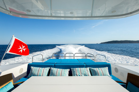 Adjacent to the salon is the partially shaded aft deck, with alfresco dining, seating and generous raised sunpads. Custom umbrellas can be easily added, for additional shade while on the sunpads. An extended swim platform allows for effortless water access to the good assortment of water toys on offer.