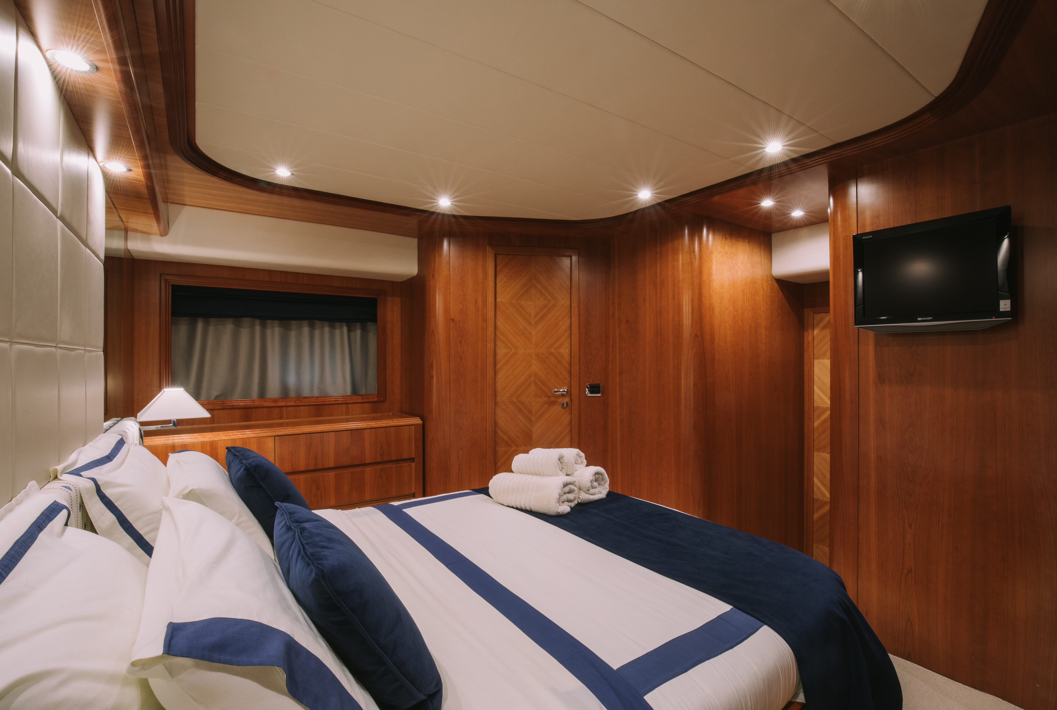 Exterior decks are plentiful, boasting an aft deck, foredeck and sundeck. The aft deck is adjacent to the salon and partially shaded with an alfresco dining table and comfortable seating.
