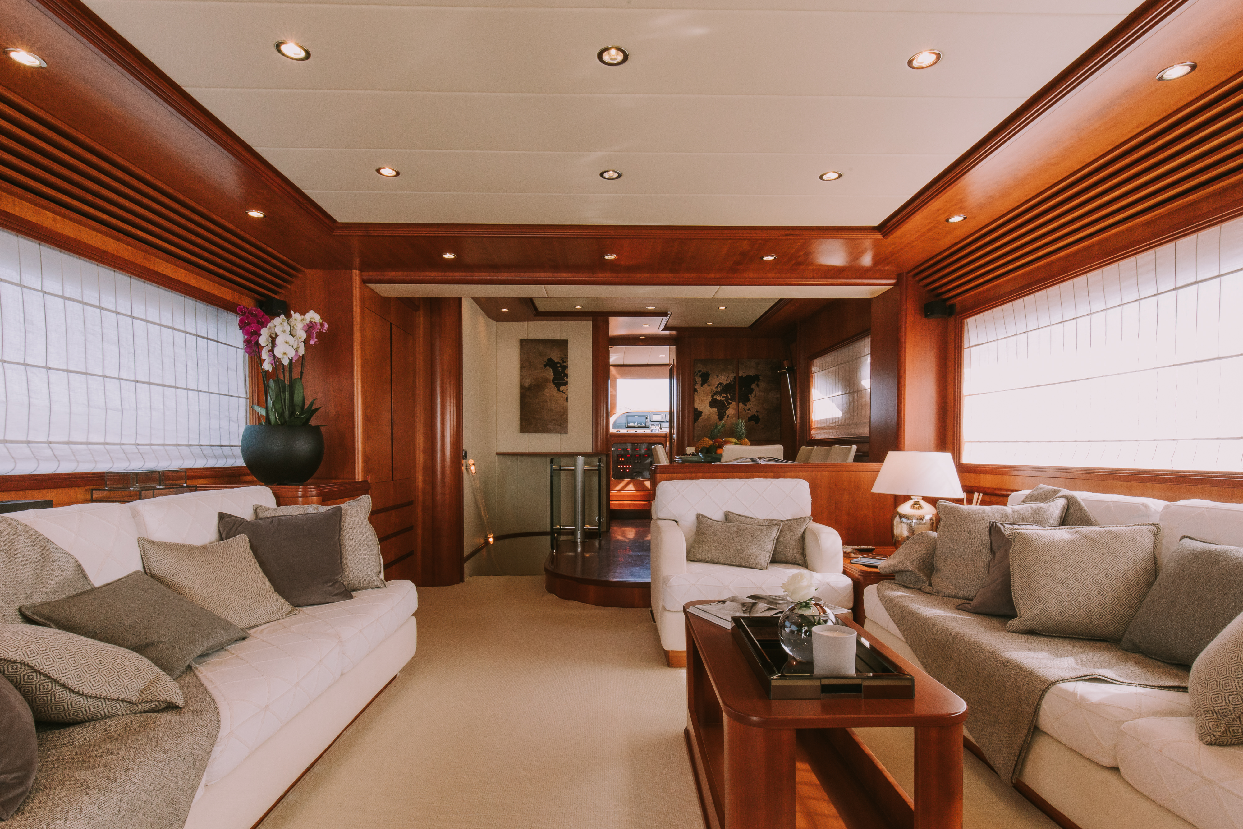 The main salon offers a generous seating lounge with sofas, occasional chairs and a coffee table aft. The formal dining area is set forward providing a slight separation from the lounge in an elegant setting. Warm wood panels and neutral furnishings create a relaxed ambience, perfect for socializing and entertaining.