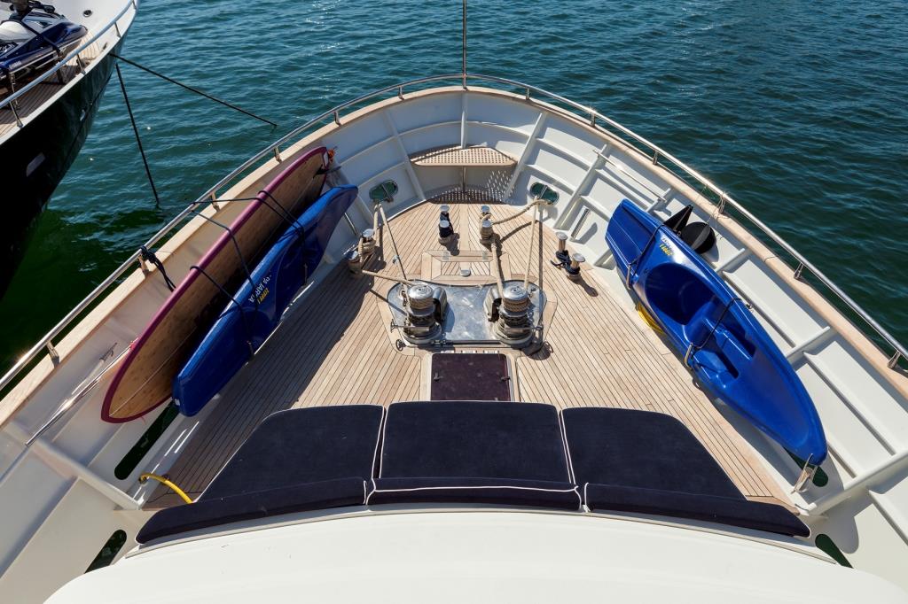 Her side decks wrap around her and lead to the foredeck and a well-appointed sunning area. On the sundeck, she offers a further alfresco dining table, seating, sunpads and partial shade.