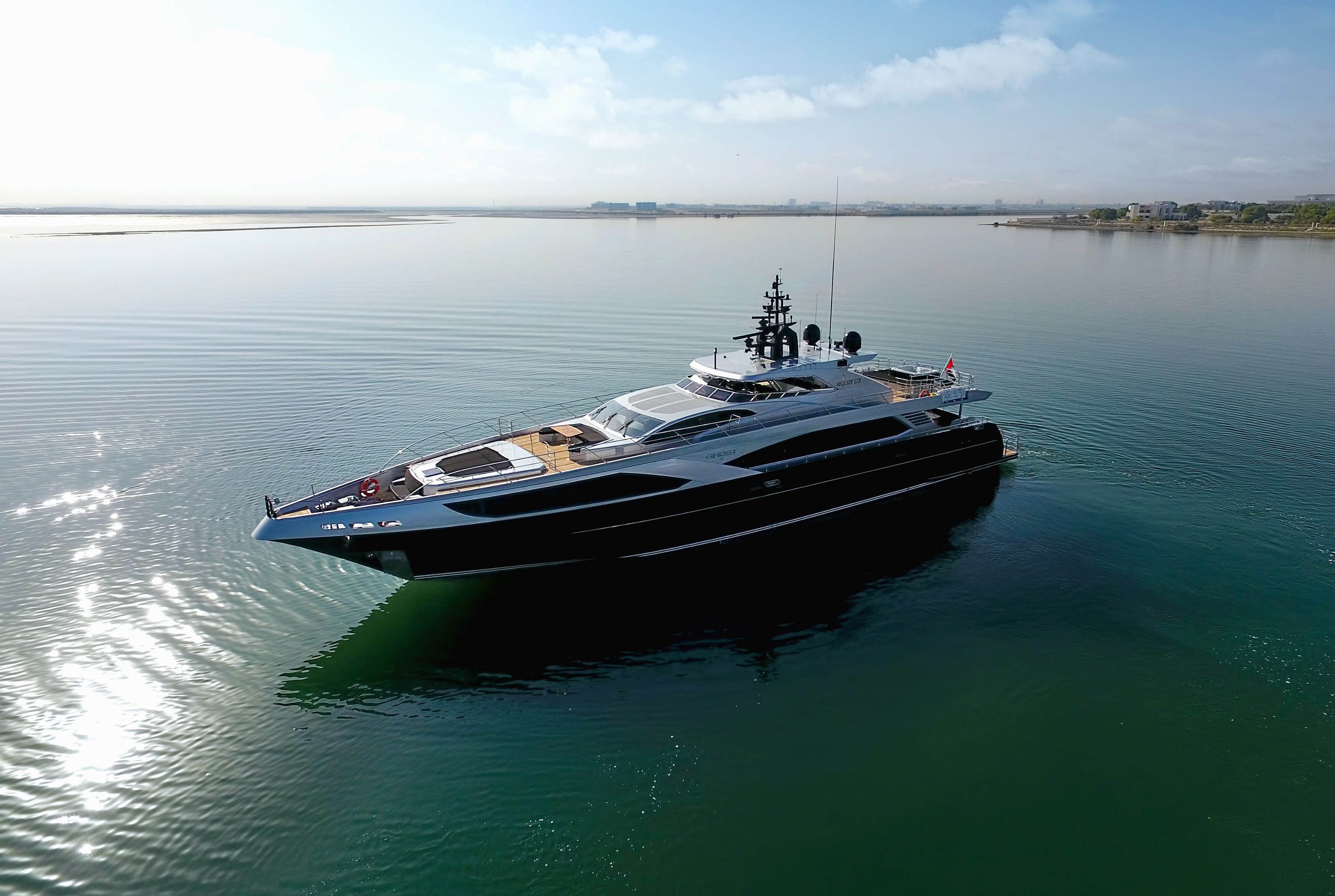 The yacht features both at anchor and underway stabilizers. Accommodation is in 5 cabins, each of which offer private ensuite facilities. On the main deck is the master cabin, forward and full beam of the yacht, with a center lined king size bed, walk in wardrobe, powder room and owners office upon entrance.